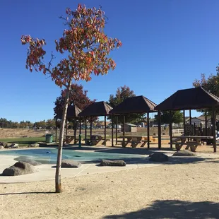First time at this beautiful park. Did not know it was even there. Toddler swings, With slides for toddlers and older children. Large covered picnic area with tables and chairs. There was even a enclosed dog parkAnother mother mentioned that during the summer they have splash ponds. I will definitely come back.