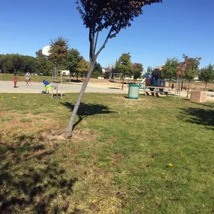 Love this park!!! It has everything you need! There are two age appropriate parks with a splash pad in the middle of the two. Also a path that you can walk on with the water running into it. Next to that there is a basketball court and a pull up exercise place. And next to the parks is a huge field followed by two size appropriate dog parks. There's even tables to sit at under a large shaded roof. I didn't notice if there are bbqs in the area, but I wouldn't put it past this park and it's vibes.