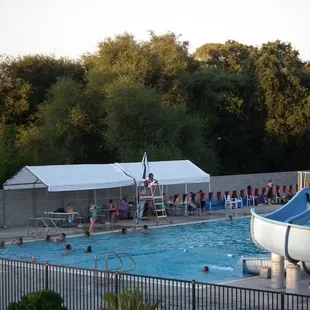 Orangevale Pool has a big blue slide. When I was very little, I couldn't slide on it. I bet I could, but I was just too scared. I just went with my dad. It has a very shallow end then it starts to get deeper. It sure is crowded. There is barely enough space to jump. Maybe that's because it's a popular pool. You are not allowed to wear floaties there. They don't have otter pops, but they sell candy. At the edge of the pool there is a shady place where there are chairs and tables where people set up. In front, there are people in the sunshine drying off.