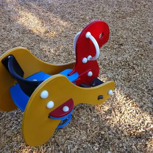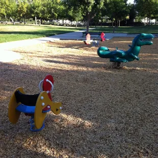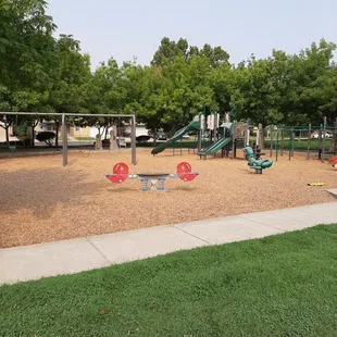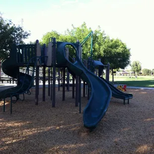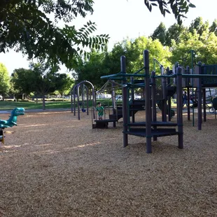 Bike trail going between the play structure and baseball/soccer fields.