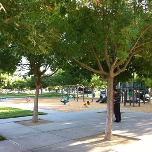Shade, play and a skate park area, win win win!!!!Its a park that looks small but is rather big in it's all.They have a kids playground area, tennis court, skate park, baseball field and a walk/bike path around and through the park.Thier is an acess to a bigger bike/walk path in the back past the skate area and over the bridge.They do have a water bubbler that has a small spout near bottom for dogs to be able to get there drink too.They do have a picnic area with a good amount of benches and tables to host a party here.Parking is on the street side.