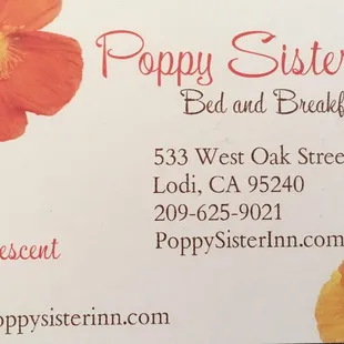 I can't say enough great things about The Poppy Sister Inn! Not only did we enjoy the proximity from the Inn to the downtown area and vineyards, we felt spoiled by the ladies who run the place our entire stay! My partner and I felt extremely welcomed the moment we set foot in the Inn and the rooms and breakfast were amazing! Highly recommend!
