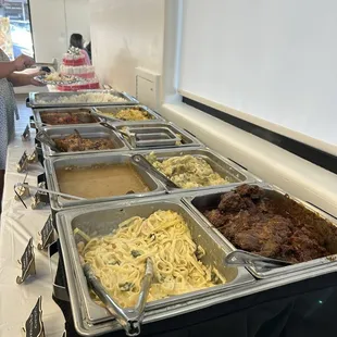 Garlic Mashed Potatoes, Roast Beef and Gravy, Shrimp Fettuccine, Roast Chicken, BBQ Meatballs and Roll
