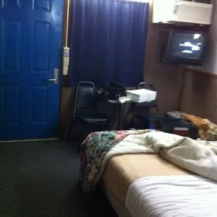 Lady at front desk was super nice . Credit card machine didn't work . I loved the bright powder blue walls and the vintage carpets . People were very friendly who stayed here . No bugs I checked. Bedding was clean I used a black light . Lots of little noises from heaters trying to heat and the nice sounds of cars passing by on the freeway . And all this for ten dollars less than other places