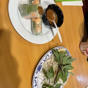 Flank steak pho with crispy egg rolls