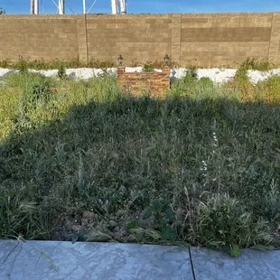 a patch of grass and weeds in front of a fence