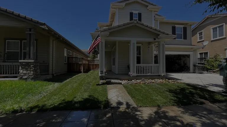 a house with a flag in the front yard