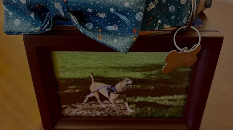 The engraving we had done on dark blue metal for Charlies urn (The date we started fostering, to the day he passed)
