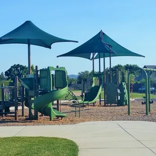 So thanks to the Yelp "Nearby" function, we found this park after having lunch in the area. It's a great family park to visit! A nice, hidden gem in Brentwood. We went to the park at about 3:00 pm on a Sunday afternoon. LOCATIONSungold Park is located at the end of Sungold Court, all the way at the end of the street, on the right side. See my pics. Street parking available, though, not lots of it, but it wasn't very busy when we were there, only about two other families. THE LOWDOWN Sungold Park is well designed because of the way it's laid out, it's easy to watch your kids. There are TWO PLAYGROUNDS at this park, one for older kids and one for younger children. There are four regular swings (no baby swings) and 2 big slides, 1 toddler slide, a stand-on merry-go-round for two, rolling tic-tac-toe, and a speakerphone/old school telephone function for kids on the play structure. The ground of the structure is covered with tanbark. Nice features of the park are that the two play structures are partly COVERED WITH AN UMBRELLA. There are also four COVERED TABLES by the BBQ area. There are two checkerboard tables that seat two per table. On the opposite side, there are two more bigger tables/benches that sit six each per table. There are two BBQ grills. Several garbage cans throughout and plenty of BENCHES around the perimeter of the play structures, so you can have some refreshments and watch your kids. GOOD TO KNOWThis park is LOCATED RIGHT OFF A BIKE PATH! So it would be a nice park to bike down to with the family or your friends, have a picnic on the grass or on the tables, let the kids play, and then continue on your bike adventure. There is a BIKE BRIDGE right across the park off of a bike path. Also, there is wire FENCING by the residential area, to the right of the play structures, which is a smart design feature. So you don't have to worry about your kids running into the street all of the sudden while they are playing. However, I would keep a closer eye on them if they are playing near the covered benches/tables, which is closer to the street entryway area. For dog owners, there's a pooper scooper bag dispenser. There's drinking fountain water for people and another water spout placed lower that for dogs. I RECOMMENDHave your kids bring their foot scooters or bicycles! There is a smooth sidewalk perimeter around the play structure area (see my pics), where your children can happily scooter or bike around, and they'll still be easily visible to you. RATING This is a great park for the features that I have mentioned. I've rated it a four for being thoughtful in design (fenced for safety, well structured - the kids love playing in it, for having the umbrella cover, and there are ample tables/chairs/benches. If it had a bathroom, I would have given it five stars. We will definitely come back to this park again! Check out my pics, they'll paint the picture of this park for you!