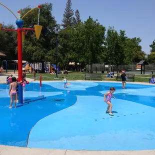 What a great park! We came just for the splash pad but there's several covered table areas, a playground, tennis courts, and basketball courts. Plenty of parking!My daughter enjoyed the splash pad while I sat in the shade. They have a few benches surrounding the pad and even has a cover on one side that protects you from the sun while you watch your kids play. It was the first day that the pad was working after being down for maintenance for a while, and it seemed like it was still trying to get the kinks out. There were several times where water didn't come out of anything and kids were just standing there waiting. The largest water feature seemed to not work at all. The only downside to the splash pad was how slippery it was. There were kids falling everywhere. All the kids rush from water feature to water feature because there's only one fountain going at once, so all the kids run and then slip. My daughter even fell on her back and hit her head and she was just walking. I don't know how to make the textured cement less slippery, but it's an issue to be looked at.Regardless, we'll be frequent visitors throughout the summer because it's free and a great way to keep cool!