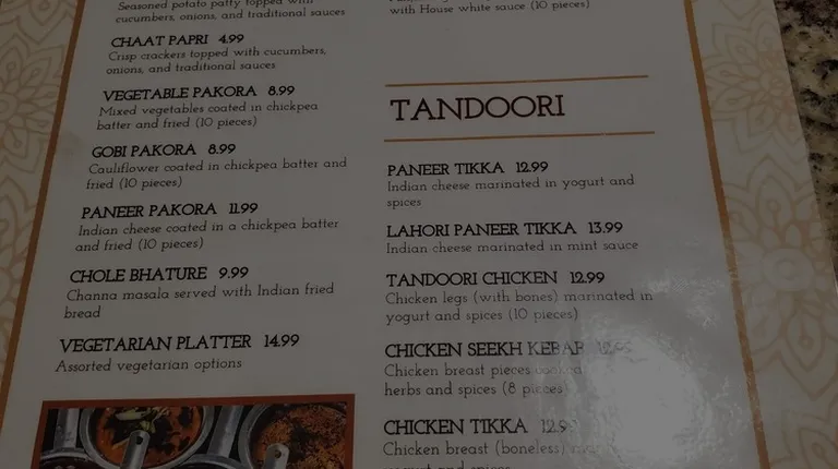 We had the following:Butter Chicken Pizza - Extra Large. $30.99. Very dry. Tasted like curry on bread. Chicken Curry. $11.99. Very good. Good spicy. Chicken Spinach (Saagwala) $11.99. Very thick. Spinach is thick with chunks of chicken. Tried to eat "healthy", not again. Chicken Karahi. $11.99. Broth is tomato based. Watery soup type. Chicken tasted very good. Very mild heat flavor. Garlic Naan. Very good. I'm used to the ones with butter and garlic. Used for dipping curries.