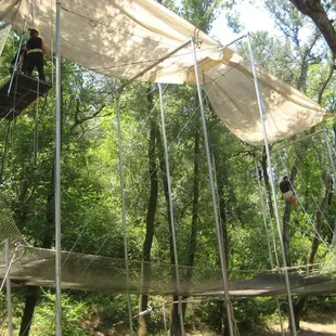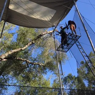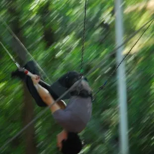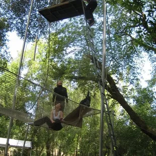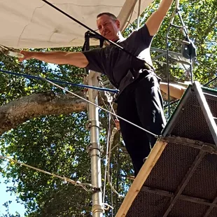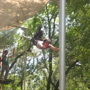 First of all, let it be known I was originally an unwilling participant. I came with a fairly large group (22 people)of middle aged office workers for a team building event. I don't like heights. I am not athletic. I don't exercise. And a lot of the folks I was with were in the same boat.First of all, the location is very pretty and calming, at least it is until you see all the gear and rigging, when you think...really?? It looks all a little rickety. And really tall.There were 4 employees working the day we were there for our private group event. Marek was the primary personality, and he was an interesting combination of intense, supportive, humorous, and a little tough, too. The owner or founder was also there the day we were there - pretty interesting guy, started doing this stuff at the age of 62! He's in his eighties now. Got up on the trapeze when we were there. I hope I'm that adventurous at that age.They started us out by having us jump onto a bar about 10 feet off the ground (Marek helped with a boost, and there was a plushy rubber mat underneath), and swing your knees up and over the bar. It's both easier than and harder than you think. But he gives you a boost and helps you out.Note, wearing clothes that will cling sort of makes sense...think about the fact you will be hanging upside down when doing this. Also, they make you take off pretty much ALL jewelry. All of it. Wedding rings, body piercings, etc. So you might want to plan ahead.Next, they cinch a super tight belt around your waist (prepare for all your fat to squoosh out, attractive!), and you climb a crazy tall ladder (40 feet high maybe??), with nothing to protect you. That has to be the scariest thing for a lot of people. Then you stand on a tiny little platform (maybe 6x10?) with one of the instructors and usually, the next person in line behind you. It's cozy. The instructor hooks up your belt to the ropes so if you completely fall off you are at least attached to something. There is a net, also. I noticed there is a second instructor at the bottom holding the ropes attached to your belt, to act as a counterweight as well as to help a bit with your swinging as needed. Then they have you stand on the very edge of the platform, with one arm on the trapeze bar, leaning your body out, and grabbing the bar. The bar feels weirdly heavy - it freaked me out. The instructor on the platform holds your belt so you don't teeter off while getting yourself a grip on the bar. The instructor on the bottom tells you when to go, and the instructor holding your belt confirms it, and off you go. It's ALL about timing. Once you get this far, the hardest thing is making yourself relinquish control and listen to Marek (or whoever is telling you what to do and when to do it). It makes all the difference in the world. And even if you're in bad physical shape, you will do much better than you ever thought possible, because gravity can be your friend if your timing is right. So you have to trust the expert and do what they tell you. Not an easy task for a group of control freaks. Every single person in our group got up there and did some swinging, no matter how terrified. All except one, I think, flipped upside down and landed with a cool flip. There was a lot of support rather than competition in our group which was really nice. And a handful of the group were able to do the "catch" - jumping off of the bar upside down in midair to be caught by an experienced instructor on another bar. This non believer actually did it (maybe not that gracefully, but still!) and made the catch, too. Very empowering experience. Uh, and a few days later, I still have some muscle pain from muscles I never knew existed ;)I'd totally go back. It was not really teambuilding per se, in my opinion, but it was a very unique empowering individual and shared experience. And it was fun.