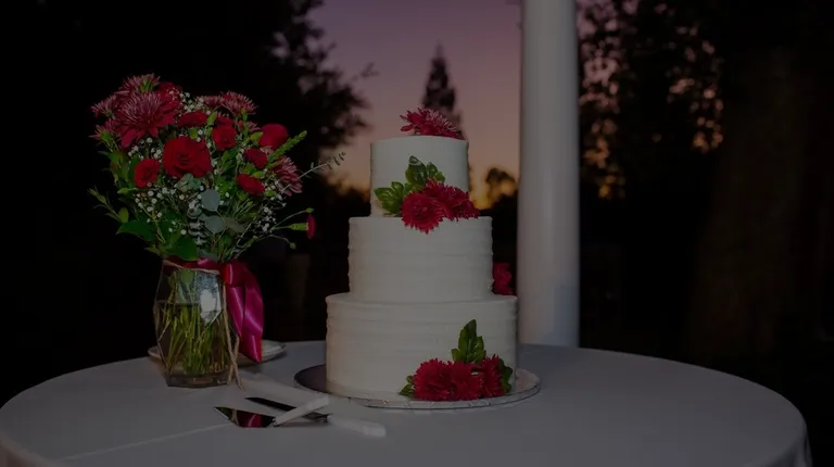 a wedding cake and flowers