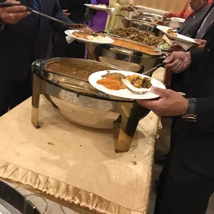 I came here to attend my friend's family-friend's wedding reception! We had a great time and took advantage of everything this banquet had to offer in their package.First off, this banquet hall is huge with beautiful decor, pretty lighting of violet, gold tone furniture, etc. the dance floor is big, the DJ stage is wide, and the buffet room is huge to accommodate a big line. Their bathrooms are clean and lots of space as well. Their service is on point. I kept observing how frequent their servers would refill waters, toss plates for new ones, food was always stocked new, etc. they coordinated well and each played their part to help with the process. I do suggest having a custodian cleaning their bathrooms at all times though. Their toilets kept piling up and the bathroom floors were getting messy by the minute. They should really have a custodian cleaning the bathrooms frequently to keep the bathroom visits pleasant. This is my only complaint but I wouldn't deduct a star from it. Their food is great tasting. They have a wide arrangement of desserts and of course, their main entrees such as fried pakura, lamb stew, butter chicken, fish, and naan, more! It was delicious and each item had lots of flavor. I absolutely loved their chai tea! I maybe had 20 refills each mug lol! Bottom line, the wedding was great and memorable. The presentation was up to par and everything here is equipt to guarantee a good reception. I'm glad I came!