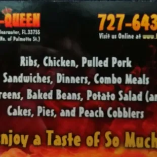 Great BBQ!! I went today and got a 3 meat plate with Ribs, chicken and pulled pork, a large collard greens and a large Mac and cheese. It was so good and had such a nice Smokey flavor! We also got the Hot sauce and the sweet and spicy sauce. She wasn't playing when she said the Hot was really hot ! My boyfriend and I loved it and will be back!! Open Wednesday- Saturday!
