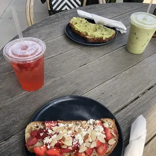 Strawberry banana Nutella, bagel with cream cheese, Matcha bowl. Iced matcha and a iced white mocha
