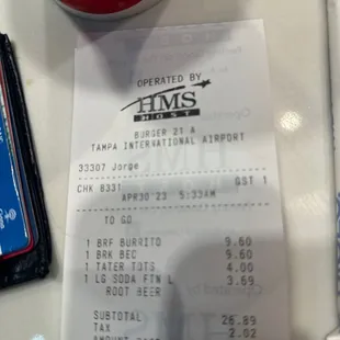 Typical airport food . The burrito was really good with the jalapeños . The bacon egg and cheese sandwich was good too ! Tator tots was crispy ! I really like the nice guy at the counter