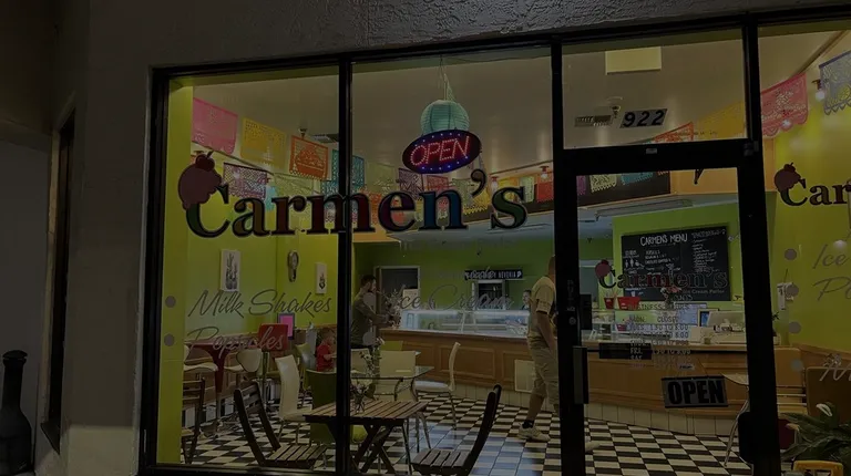 This was our first visit to this hidden gem and what wonderful flavors unique to traditional ice cream shops. They make all of the ice creams and popsicles or bars in house. Some of the unique flavors of ice cream are avocado, spicy pineapple, spicy mango and sweet corn. They also have a wide selection of typical flavors of ice cream and sorbets to choose from like coffee, chocolate, cookies and cream, mint chocolate chip, strawberry sorbet etc. the cafe is fairly small with 3 tables and 2 high tables. Prices are nice with one scoop fir$2.35, 2 scoops for $4.25, shakes $4.99 and popsicles are $2.35 - $2.85. Carmen's is located next door to the movie theater and I know we will be coming back to enjoy more of these wonderful flavors and popsicles. Tonight we ordered a strawberry ice cream popsicle covered in chocolate and rolled in peanuts, a scoop of Strawberry Sorbet and a scoop of Avocado ice cream and a cup with a scoop of coffee and a scoop of chocolate ice cream. The Avocado ice cream had a mild creamy flavor and was very nice. The strawberry sorbet was a great full flavor strawberry. The coffee ice cream has a very nice and pronounced flavor and it married well with the full flavor chocolate. Tonight they had 24 flavors of ice cream and quite a few flavors of popsicles giving us quite a few visits to sample everything. We definitely recommend a visit to Carmen's Homemade Ice Cream.