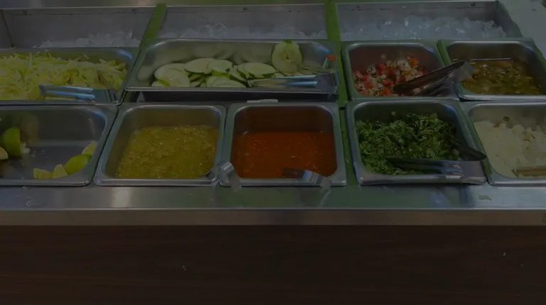 Salsa bar with salsas, pico, cucumber, jalapeno, cilantro, onions, and limes
