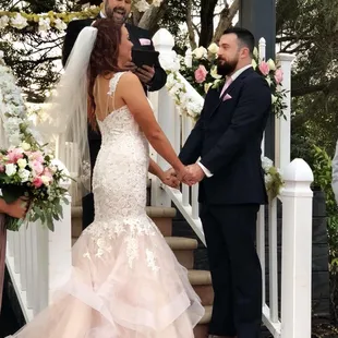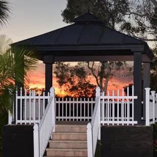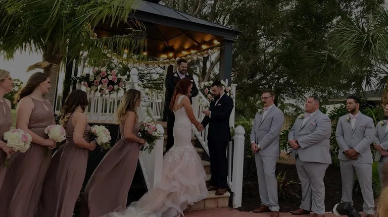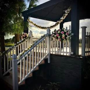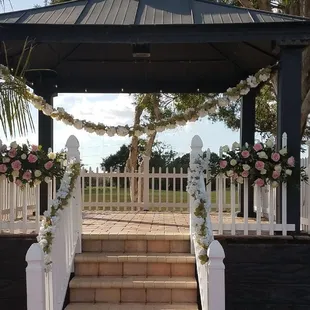 Attended a wedding recently at this venue. Just the ceremony was hold outdoors while the reception was elsewhere. Great outdoor space, lush green grass, palm trees, and water surrounding a gazebo. The gazebo is raised, 6 steps up on a platform. Unfortunately due the weather the original gazebo was destroyed and there was just a temporary one placed. Not as pretty for photos but still kept the sun off of the newlyweds. From the left side, mostly hidden by palm trees, there is an exposed area under the platform with random concrete and trellis. Overall a nice outdoor space for a wedding.