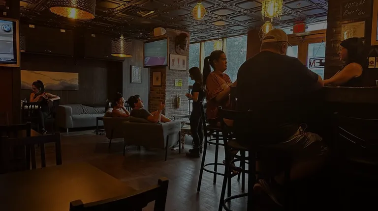 a group of people at a bar