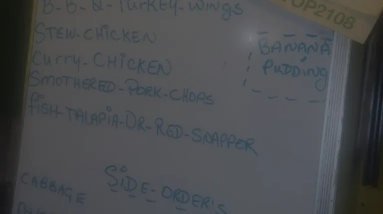 Snapper, Tilap, Stew chkn, Curry chicken, Ox tails, and BBQ ribs. Sides: mac n cheese, collards, cbg, corn bread, okra n toms + sweet potat