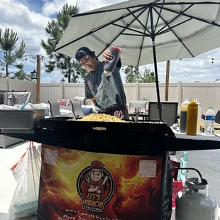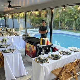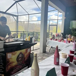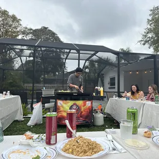 I held a surprise Friendsgiving for my neighbors this weekend. Tim was our chef and he did a good job with his interaction with all the various ages and nutritional needs. The the steak, chicken and rice could have been more tender, however it was flavorful and seasoned well. I did not expect the request to use my kitchen to clean his tools, however it was done with minimal disruption to the area. Tim's engagement helped make the event a success and I will definitely consider Lets Hibachi again.