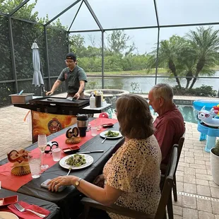 Being the newest trend....I was so excited to book a hibachi dinner at the comfort of my own home to celebrate my mother's 60th birthday with family. It was VERY easy to schedule with Shelly all through email. I was a little nervous since only communication was email till a few hours prior to event chef Tim text! The food and entertainment was great. However, some down falls that did not sit will with me nor my guest were with Tim starting extremely early, leaving way before the ending time confirmed, cleaning his dishes at my home, and leaving his trash behind without asking us to toss it. The food was good and great portion size. However, with the price associated with this service some more professionalism should be displayed. Overall it was a good experience but not sure if we would do again.