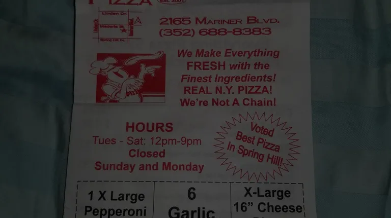 The worst pizza I ever had from a pizzeria. This guy had the audacity to charge $4 for a little slice that was horrible. If you're looking for the worst pizza in Spring Hill go to Mark trash Anthony's. He try's to pretend that he comes from NY and knows what good pizza is. He is a pretender that wouldn't last 2 days in NYC. I wouldn't be surprised if this place goes out of business soon.