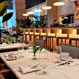 With the Market being inside to Edition, everything is beautiful and new, however when walking up, you realize that you are just in a "fancy" hotel bar area which was disappointing to my better half as he did not realize when he made reservations based on pictures and pricing. He actually immediately apologized and asked if I was okay with it or wanted to leave as we were there for a celebration and a hotel bar wouldn't be something we would book for something like that. As he rarely books our dinners himself, I smiled and said it was fine as the place was pretty and at such a late time, it would have been hard to fine another place to switch to. Reviewing the menu, it was on the smaller side I did find us an appetizer that we both would agree on and I was happy with the price. I ordered the Beef Carpaccio and when it came out, it looked lovey but then we realized there were no toast points and any type of bread to eat with it that normally accompanies the plate. Ben was not a fan of that as he normally always wants more than what they serve to begin with. I will say, you could tell the ingredients used were very fresh. For our entrees, I ordered the only steak option available which is a New York Strip, not normally my choice at a restaurant but again, it was the only steak option. It came with potatoes and a salad of some sort along with a mustard sauce severed on the side. Ben ordered the mushroom pizza since there was nothing in the entrees that stood out to him. When they came out, my plate was given to me without a streak knife so for about the first 5 minutes I was trying to cut it with the butter knife that was already on the table until the waitstaff was close enough for us to get their attention. As I was not working with something like a filet, this did not work too well as you can imagine. The potatoes were plain and the only thing that saved them was the dipping sauce, which I used sparingly. I generally do not like to rely on sauces. When trying the steak, gave it several bites before saying anything to Ben but the streak itself lacked any seasoning at all. I looked over the entire thing, but sides carefully and couldn't find any sprinkle of salt or pepper on it at all. Nor taste it. This was very odd as anyone knows that a quality piece of meat should only need salt and pepper and yet for $52 mine lacked any. I actually used the mustard sauce provided for the potatoes to dip the steak in a little as there was neither salt or pepper on our table either. I didn't feel like waiting around for another steak to be made for me if I said anything so we just let it be and actually enjoyed the $17 pizza more than anything. To me, this place felt like it is a place where people want to go to be seen by others walking by through their wall of windows vs a place to get an enjoyable meal.