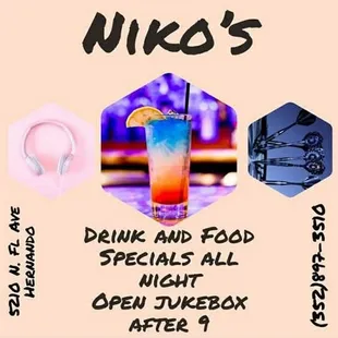 We stopped in to Nikos one Friday around 530pm a few weeks ago. We have driven by it several times and were finally able to give it a try... the picture of icy martini style drinks displayed in the front window really struck my happy hour alert, and a frosty lemon drop or cosmo were really sounding good. We went inside and were surprised to find the place almost empty, only a couple of other people were there, and only 1 other person was eating. My husband is a beer drinker, but they only had run of the mill selections, no Red Right Return or similar, but he was fine and ordered a beer. I ordered a lemon drop and was expecting a a chilled glass, but sadly the bartender handed me a styrofoam cup. When I asked about the glasses on the pic out front she shrugged and said they only used styrofoam. She also said they didn't really have actual lemon drop ingredients (?) but the drink was ok... We decided to order food and I had a burger and I don't remember what my husband ordered. The food was pretty good, and strictly based on that I would probably give this place a better rating, but overall I can't do any better than 3 stars. The interior is very dark, kinda dreary and quiet... I would love to give them another try if they could make a few changes: improve their drinks and bar ware, train their bartender better in general, and maybe keep some music going to liven the place up.