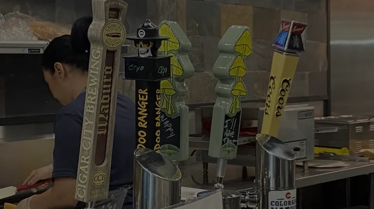 Bar stool area perfect for enjoying a cold brew on tap. sandwich and a soda
