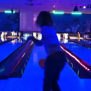 Food is small and expensive. A glass of wine is $8 and a rum punch in a small plastic cup was $11. A bucket of beer is $22. Basically don't plan to drink much there unless you want to pay a $100 bar tab, not counting a $30 buffalo chicken pizza. Galactic bowling is the most expensive of everywhere around me at $20 a person. My husband had his brand new ball damaged and they offered to fix it. We denied their offer and brought it to our local shop we can trust. I don't recommend this place especially if you plan on drinking expensive booze and paying too much for less than average food. Police on premises during galactic bowling and stationed outside in a cruiser when you leave.