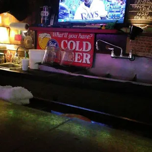 What a great dive "bar"! No liquor, but beer and seltzers are available. Cool bartender and a dart board.