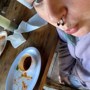 Lamb barbacoa, carnitas, asada tacos. The red sauce is so good! Both are spicy.