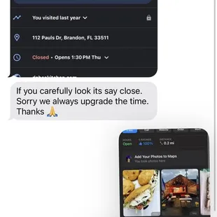 Although the food looks good and I wish I could have tried it the customer service is what makes me not want to try it anymore. On May 1st, online it appeared that Dchos was opened and when I arrived it was closed even though it was between their buisness hours so I called the number online and the owner said they had closed due to a family emergency and woikd be open the following day and that online it shows that was it was closed. He should have left it at that. However, he shortly after texted my number with the screenshots saying it was closed and told me " if look carefully it says close" I thought that was very rude and and didn't have to go as far as to text myNumber, although on my end it said OPEN!