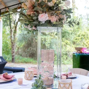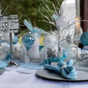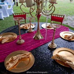 Beautiful table decor - tablecloths, runners, napkins, placemats , charger plates and center pieces to match chosen theme.