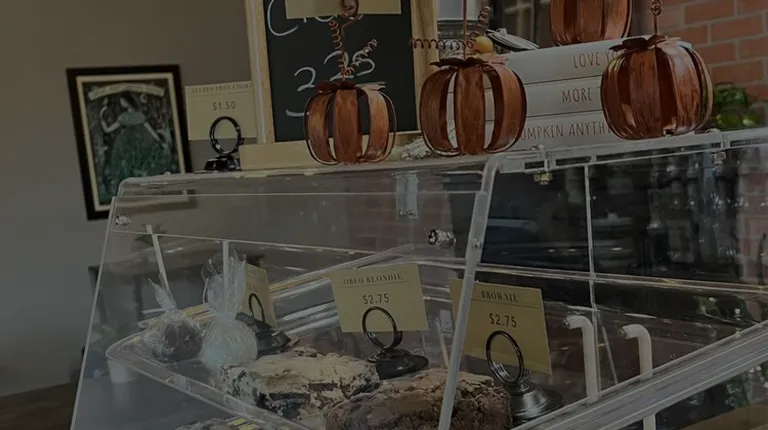 a coffee shop with a brick wall