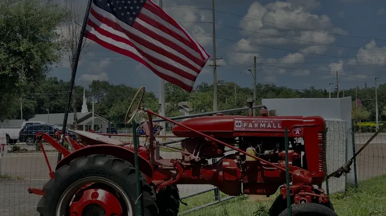 a farmer's market with a tractor in the background