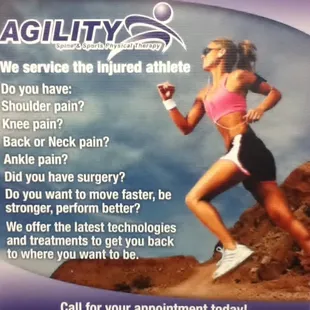 Angels and miracle workers work here. Last month, I attempted to lift a very heavy 95 pound object and popped my L3 right out of alignment. It sounded like a champagne cork when the injury occurred. It was one of the biggest mistakes I've ever done in my life and a bad lesson learned. After it happened and for days afterwards, I could hardly breathe and was in a lot of pain. I could hardly walk let alone (try to) bend over. My therapist, Lauren, is a gifted "healer." It's like she can see into my body and knows every spot that's affected just by her touch. Not only does she inspire me to work harder at the exercises, she offers encouragement when I need it the most and she is very empathetic. She truly cares about her patients and it shows. I had given up hope that I would ever get better again but I am... slowly but surely. I am making progress and feel like I am on the road to recovery. I'm so glad I found this place. I would highly recommend this PT clinic. I've been to other clinics in the past 25 years for knee problems and hip replacement post surgery PT. Agility PT is, by far, the best PT clinic I have ever been to. I'm also thankful it is on the west side of Tucson just up the street from where I live. Very convenient. The office staff is equally incredible.