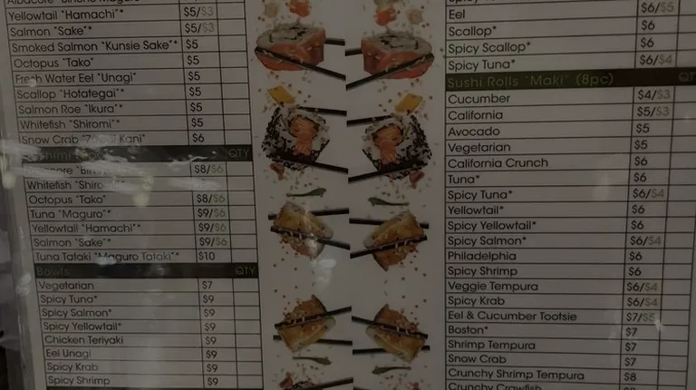 One problem with the way the restaurant advertises its food is the large menus above the bar only show SPECIALITY rolls.Use menu