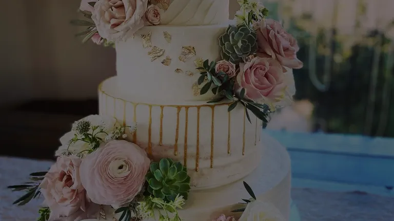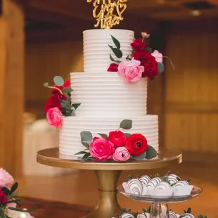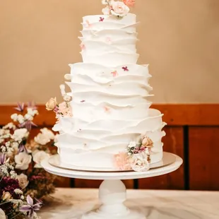 a wedding cake with flowers on top