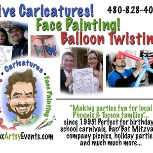 I organize events on a regular basis with local businesses all over Tucson. For recent large scale Yelp Event, I made it my mission to search for local businesses right here on Yelp, so that's how I found Artsy Events! I also made it my mission to use some of the features and tools that I hadn't used before...like "Request a Quote." I used RAQ to contact Artsy Events and they responded to me within 24 hours. So that was a great start. We communicated over email and phone to discuss their services and prices. I was looking for entertainment that would be suitable for a childhood themed event. Artsy Events specializes in connecting you to various types of artists- from face painters to balloon twisters, caricature artists, henna, airbrush tattoo artists and more. I decided to go with the Airbrush tattoo artist. They follow up via email and invoice you for 20% of the fee and the rest is due after the event. They connected me with the artists about 48 hours prior to the event so that we could have each others contact info. Claudia, was our airbrush tattoos artist- she showed up on time and did a fabulous job! Our guests had a blast at the airbrush tattoo station. Artsy Events services the Tucson and Phoenix area. They were super professional, well priced and extremely nice! I definitely recommend them and would work with them again!
