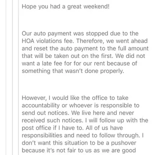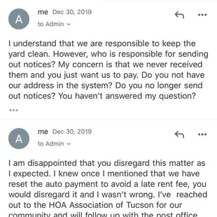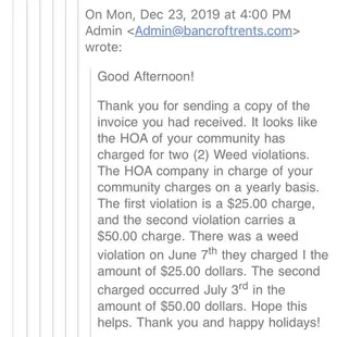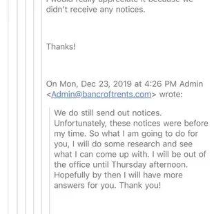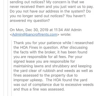 We are a current tenant at one of their homes and they gave me no choice, but to express myself here. We have been there for 3yrs and our experience has been pretty dissatisfied and disappointing. Regardless of the negative feedback they've been receiving, they continue to mistreat their tenants and take advantage of them when possible. This is purely from my personal experience with the company so far and can not wait until our lease is over. This review is based on their business practices and customer service. We received a notice from HOA regarding our front yard the second year we lived here in 2018. This year, we received a fine letter on December 19th for a HOA violations back in June 7th and July 3rd, 2019 from Bancroft not HOA. I understand we are supposed to maintain our yard, but my biggest concern was who is responsible to send out notices to tenants? If we had received the notices like we were supposed to, we would have taken care of the yard like the last time we did. I emailed Bancroft regarding this issue trying to get answers and was told they would look into it for almost two weeks. They have added the fees to our rent money and our auto payment has stopped. We had no choice but to reset the auto payment so they can withdraw rent money on the 1st of January 2020. I hesitated to tell Alyssa about this because I knew they would disregard the matter, but I told her anyways knowing the outcome already. And sure enough, as soon as she received my email about it, she disregard the matter without answering my questions why zero notices was sent out to us and who was supposed to be responsible for it. I emailed her and told her I've expected that they would do this to us and will yelp about it. I've email our HOA community manger Shaw and she couldn't find us on their database which means we are not register as tenants living in this house. This falls under Bancroft since they are our mgmt company and obviously they refused to take responsibility for failing to send us notices or register us to receive notices from HOA. If they don't correct their mistakes, we will continue to get fine without notices and if this is a perks for them to make extra money? Then they're doing a good job so far, I don't know and can't understand. I only hope this feedback will give them a sense of responsibility and register us as the current tenant living in this property. Bancroft, if you don't want to do your job, make sure you let the owner know so they can register us as the current tenant. I've attached all of my emails with Bancroft on here because I'm not happy with their business practices and customer service. Read the emails for yourself and decides if you want to improve your business or continue to take advantages of your loyal tenants who never fails to pay rent on time. On another note, i also believe we will never get back our deposit money according to many reviews below and how they have handled things thus far. Our house is in the same conditions as when we moved in 2017! Lastly, I know you don't want negative reviews but we can't help it. Hope this feedback will encourage you to improve your business practices and customer service. Especially when you have more negative comments than positive.
