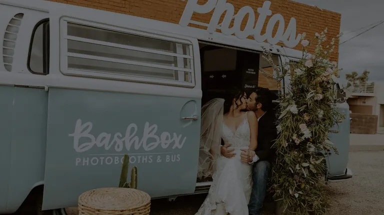 Styled shoot of bride and groom taking photo in a 1970 VW Bus Photo Booth