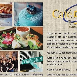 Visiting Tucson, Arizona last week and decided to try some lunch places downtown around Pennington Street. Stopped into Cafe 54 and found the atmosphere to be bright and cheery with plenty of artwork to capture anyone's attention. We ordered the Ceasar Salad with chicken and The Hero's Gyro with grilled gyro beef. Both were excellent with a great choice of Green Tea and fountain drinks. We ordered at the front area where we were met with cheerful employees to take our order. In moments, our food was brought out with a smile along with some of their famous rosemary rolls with butter & olive oil. The prices for their entrees are totally reasonable. Cafe 54 is a great find and they appear to be serving a great purpose for their community here in Tucson.