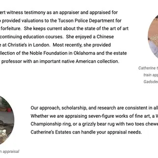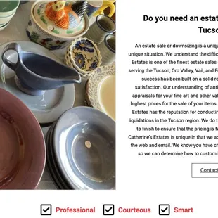 Since this is an estate sales company, the assumption would be that one would consider hiring this company as someone has passed away, and the heirs would like to liquidate any remaining items in the estate after they have removed any items that they wanted, or were entitled to. Then an estate team, like Catherine's, would be contracted to sell the remaining items left in the home/estate. Catherine's reputation and knowledge in antiquities is vast, but what she gains in the expertise in inatimate objects, she severly lacks in professionalism, integrity, respect and honesty in dealing with people. If you are considering hiring her and her team because you are the heir to an estate, and have no intention of occupying the deceased 's residence, make sure that the items you or the other heirs want, or are entitled to, have been removed from the premises BEFORE Catherine ever comes to review the remaining contents. Once you are under contract with her she has total control on the contents of the estate.If you are considering hiring Catherine and her team because you are downsizing, moving etc. make sure to remove ALL items from the estate/residence PRIOR to Catherine coming to review the contents that you want sold. Also do not even consider hiring her if you are going to still be occupying the residence a month prior to the sale while they are staging your home, and during the several days of the sale. Fair warning....She will want to bring in her own inventory items that have not sold in other estate sales to add to your sale, which means that she will be utilizing your home/estate with her inventory, along with your possessions. This will obviously take away from the sale of your possessions, making her more money and you less as her items may sell and yours may not. If you are not ok with that, add a clause to the contract that very specifically states that she cannot bring in her own inventory to be added to yours. Review the contract with other family/friends for their input prior to your signing it. A contract with Catherine is ironclad and she will be very difficult to deal with after the fact if you do not put your intentions in writing on the contract. I have seen her rudeness, abrasiveness, dishonesty, lack of tact and integrity first hand as she cares nothing more than making money.These warnings come from a recent unfortunate contractual estate sale in which Catherine was hired, and the client was not able to get out of the contract when Catherine's true colors came into full view.