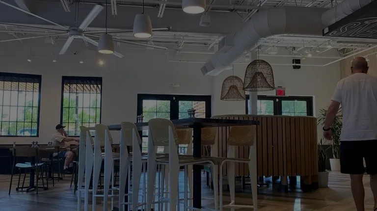 a restaurant with wood tables and chairs