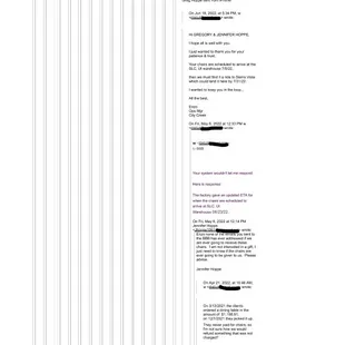 This review has been in the making for almost 2 years. After receiving my order I waited a couple of weeks so that I could write an honest review now that my anger is over. We all suffered through COVID restrictions they were not pleasant for any of us but none more so than the small businesses. We went out of our way to support small business through out Cochise County. We had a previous experience with City Creek through our son and were working on a re-do of our kitchen. We found the perfect dining set here. We understood that it could take 52 weeks or a full year to receive our merchandise. We were okay with that, we were supporting a local business and could complete our project before it arrived. We placed this order in March of 2021, we received our table in July and this is where everything went to hell. First of all this business uses and email address that will go directly to your spam filter. We were able to work that out. We were never told why the chairs didn't come with the table but hey we had the table so we assumed the chairs would be coming soon. We called to inquire in August if they had any status and were told that oh they should be here by the end of September. September came and went so we were in Seirra Vista in November and decided to stop in, oh no, the chairs would not be here until January. Oh okay, we are still with in the 52 weeks so it was a bit frustrating but we were okay. What transpired from there was just amazing, in January we were emailed a response after a phone call that said the chairs would not be here until March 19. Guess what, that put us officially over the 52 week mark and we had to spend the next 9 months continually emailing them for updates. This is not customer service and no customer deserves ever to be treated the way were when this company missed their deadline. We understand delays happen but it was up to this company to contact us when deadlines passed, that didn't happen. I have attached the email correspondence to show the epic disaster of this transaction. We were told they would provide us loaner chairs but had to return them in pristine condition or be charged for them as well. We were forwarded internal emails from the distribution company that they work with. The worst part of that is that at one point it completely disproved what we told in a previous email about where the chairs were. But wait it gets even worse the email they forward to us had been received 10 days before they sent it to us!! I have never worked with a business that went out of their way not to provide customer service. There was absolutely no sense of urgency to help us once they missed the 52 week deadline. I will say that they offered us a gift but honestly, I could not accept it at that point it would have solved nothing and would not have come close to compensating my husband or I for the time we had to take from our day and jobs to deal with this situation. The owner will surely respond to this review, and I don't expect he will be kind about it so that's why I included the full email thread, with the only redaction being done to protect everyone's email address. I sincerely hope that should this company find themselves in the same situation with another customer they will take the time to proactively contact their customer and show a sense of urgency in rectifying the issues.