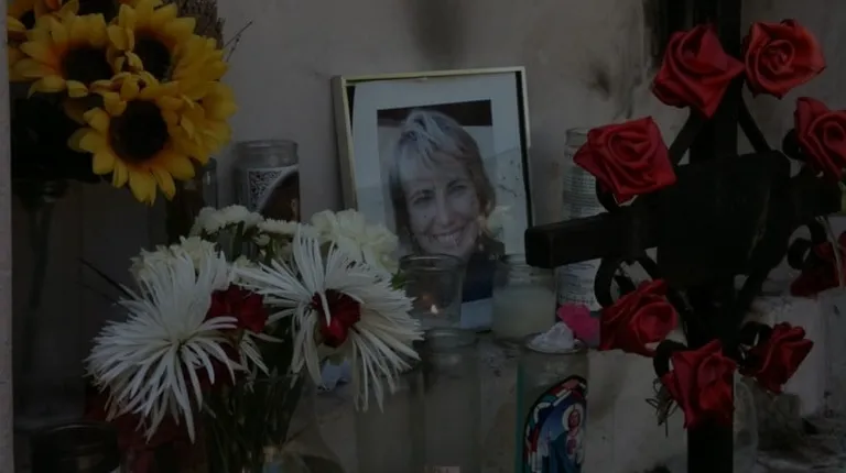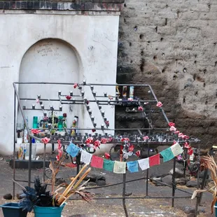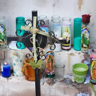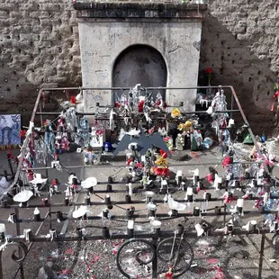 Crosses, candles and personal memorabilia decorate the area. The ground & shrine walls are saturated with candle wax.